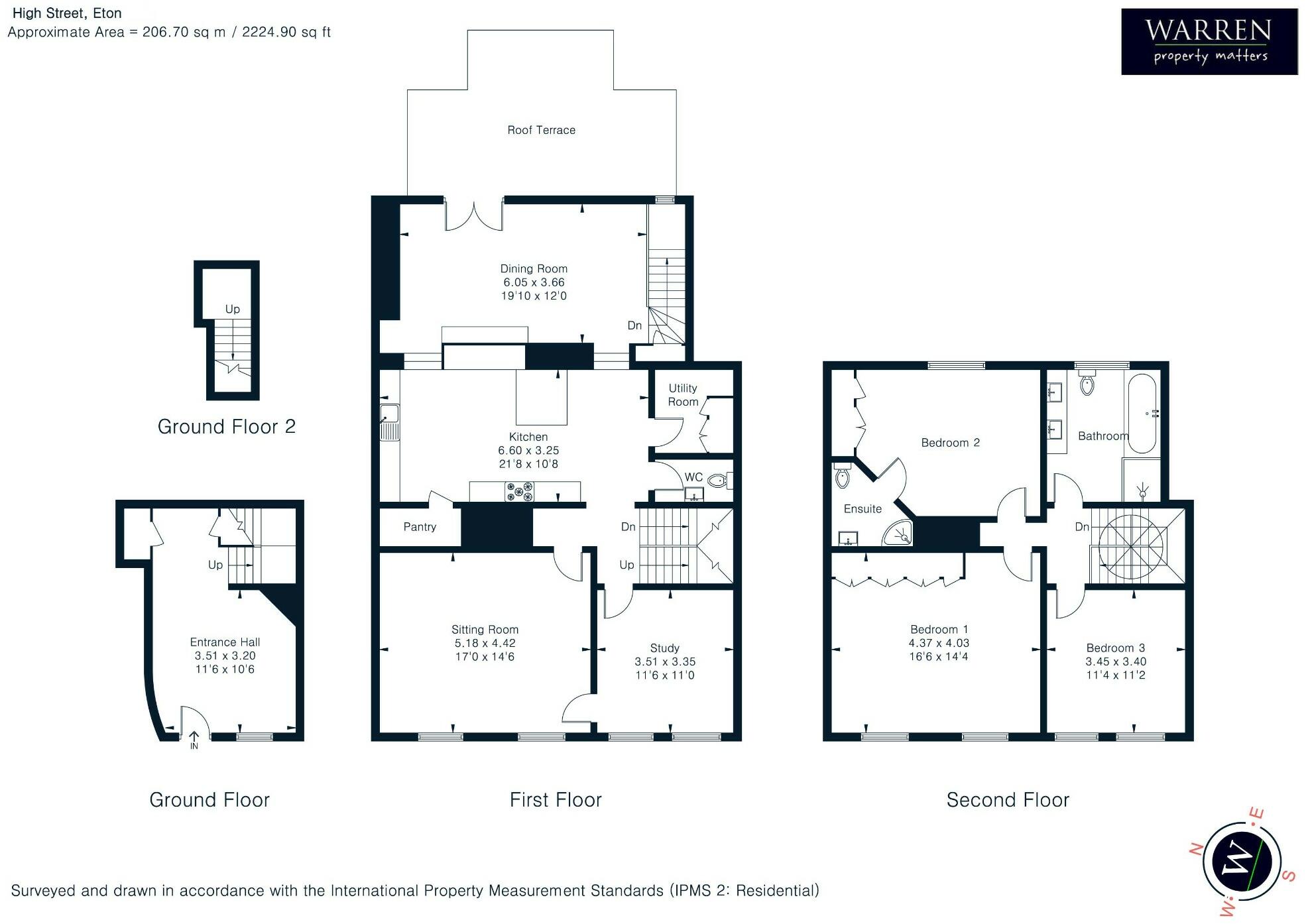 This exceptional three bedroom town house is situated in the heart of historic Eton, on the main High Street, close to Windsor Bridge providing an excellent lifestyle with all your needs on the door step. Stepping through the front door you immediately realise and admire this fabulous unique property with its impressive entrance hall with stairs leading to the first floor areas, directly ahead of you is the spacious bespoke designed kitchen with a beautiful island and breakfast bar in the centre of the kitchen offers ample prep space and a sociable hub for gatherings with steps down to the dining area flowing effortlessly to the welcoming roof terrace garden. There are rear stairs that lead down to the rear garden and courtyard.